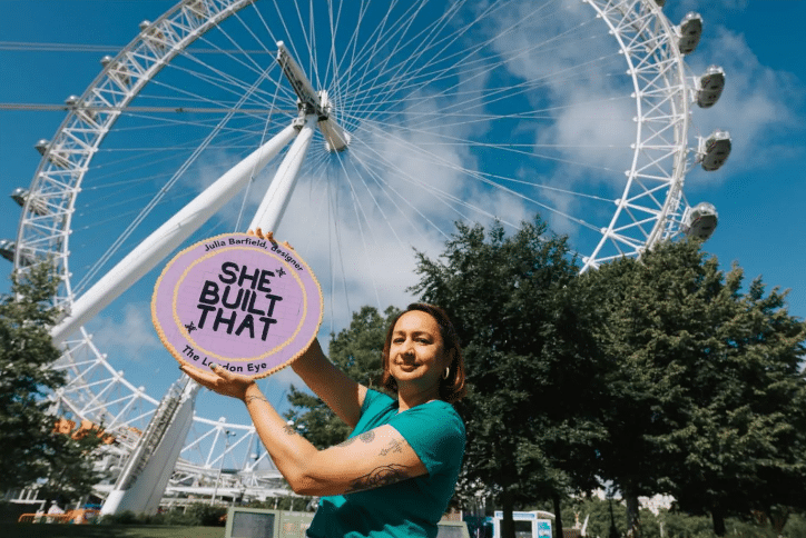 This may be the strongest part of the campaign: LEGO honored women who helped shape London landmarks with brick-built plaques reading “She Built That.” Examples included Waterloo Bridge (65% women workforce) and the London Eye (co-designed by Julia Barfield).