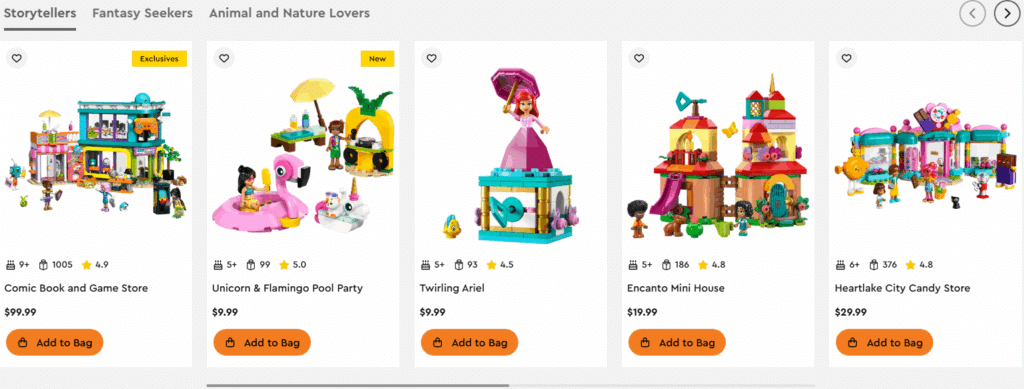 - Break stereotypes in set recommendations: Don’t just push Friends and Disney sets, instead spotlight Technic, vehicles, architecture, and beyond.
